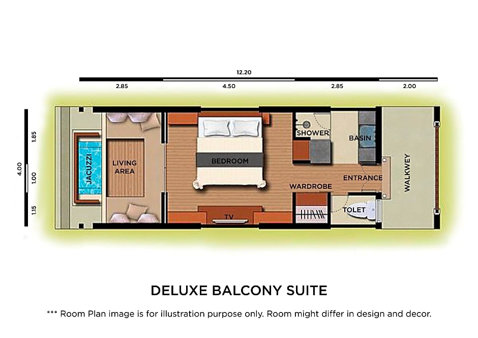 Deluxe Balcony Suite is 474 square feet and includes a king-size bed 150-183 width.